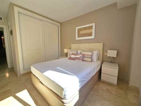 This fantastic 2 bedroom, 2 bathroom apartment is located in the popular area of Elviria, Marbella. Located in a front line golf development with 4 swimming pools, this property boasts fabulous open sea and mountain views and is just a few minutes drive from all amenities. Located in Los Lagos de Santa Maria, this first floor apartment has a large terrace with enough space for dining table, sofas and sun beds.The apartment comprises of 2 spacious bedrooms, 2 marble bathrooms (one ensuite), and a lovely bright sitting room/dining room that takes you straight onto the large terrace. The kitchen is fully fitted with a handy laundry/utility room and there is hot and cold A/C throughout the apartment. The configuration of this apartment cleverly allows the possibility of opening up the kitchen and creating an open plan living area if wanted by the new owners.