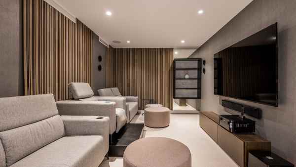 The lower level of the home includes two additional bedroom suites, a guest toilet, cinema room, utility room, and a private garage for two cars.