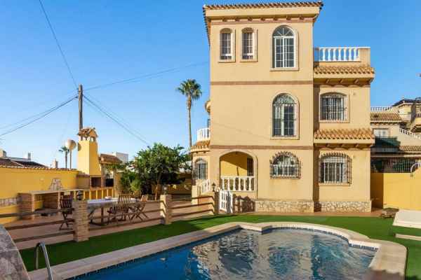 Welcome to your new home in Orihuela Costa, in the charming area of Las Mimosas!~~This spectacular house is presented as the opportunity you have been waiting for to live the life of your dreams in a paradisiacal environment. With a generous area of 161 square meters and a plot of more than 300 square meters, this home is an oasis of space and privacy . In addition, its location just 3000 meters from the beach guarantees you the pleasure of the sea and the sun always at your fingertips.Enjoy the spaciousness of this 5 bedroom home, with the advantage of a room on the ground floor for added comfort. On this floor we also find a bathroom. The first floor offers 3 bedrooms and 2 bathrooms, 1 en suite. On the top floor we find the fifth bedroom very bright.~~This property is ready for you to move in and feel at home from the first moment. The equipped kitchen will allow you to give free rein to your culinary creativity, and the south-east orientation provides you with incomparable natural luminosity throughout the day. The additional amenities of this house are countless. Enjoy the convenience of running water, the comfort of air conditioning and the security of an alarm system. Built-in wardrobes, a pantry and a laundry room make it easy to organize your daily life. The house comes fully furnished, meaning you can move in without complications and start enjoying your spaces from day one. The garden, with its trees and a barbecue area, becomes the perfect setting for your family gatherings and outdoor moments. Relax and immerse yourself in the waters of your private pool or join the community in the community pool.~~The solarium offers you a corner of tranquility for your moments of reflection, while the clear views and the Mediterranean breeze caress your soul. The location of this house is simply exceptional, with shopping centers, hospitals, parks, supermarkets and children's areas nearby , which makes everyday life extremely comfortable.Community fees are only 402 euros per year, which guarantees the impeccable maintenance of the common areas.In short, this house in Orihuela Costa is much more than a property ; It is a lifestyle.~~A life of comfort, beauty and tranquility awaits you here. Don't miss this opportunity and contact us today to visit your new home!~~Taxes and completion fees not included.