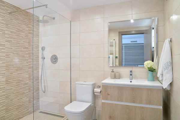 This luxurious abode includes three bathrooms, all with underfloor heating for that extra touch of comfort. One bathroom features a jacuzzi and walk-in shower, while the two en-suite bathrooms are equipped with walk-in showers. The three bedrooms come with fitted wardrobes that have sliding doors and internal lighting, plus there's an additional wardrobe in the corridor. For your laundry needs, there is a separate room fully equipped with both a washing machine and a tumble dryer. The back terrace includes lockable storage space, perfect for keeping your belongings secure.
