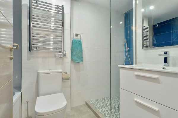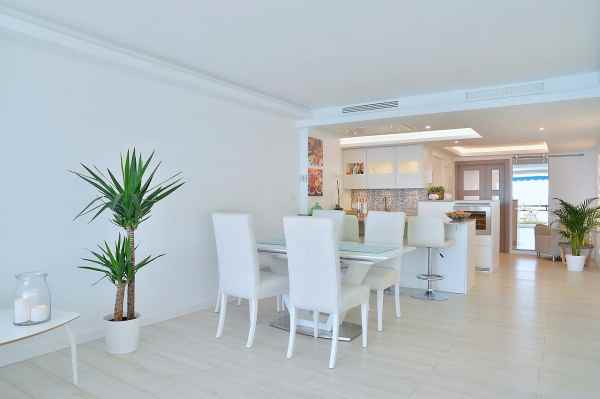 The apartment has been meticulously renovated to the highest Scandinavian standards, featuring fully foldable double windows that open up to the front terrace. With hot and cold AC split into five individually regulated zones, comfort is guaranteed in every room. The kitchen is a chef's dream, furnished with high-end Scandinavian style units from Nordic Muebles, and equipped with top-of-the-line Electrolux appliances and stunning Sillestone worktops. The induction stove caters to all culinary needs, all complemented by an automated ceiling-integrated fan. Additionally, the kitchen boasts an integrated wine cooler and a spacious American fridge with double doors and sliding freezer drawers.