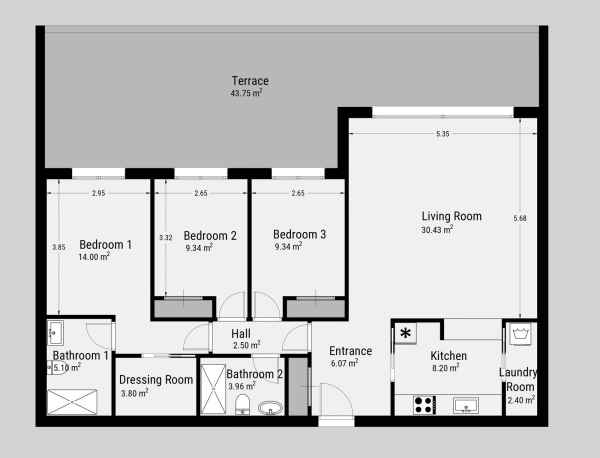 The apartment features three bedrooms, each with direct access to the terrace, creating a seamless indoor–outdoor lifestyle. The open-plan layout and modern finishes give the property a fresh and elegant feel throughout.
