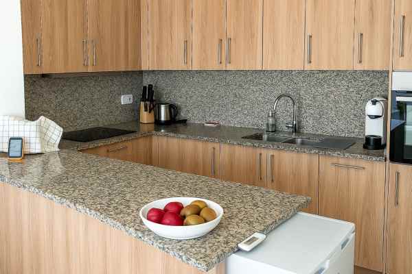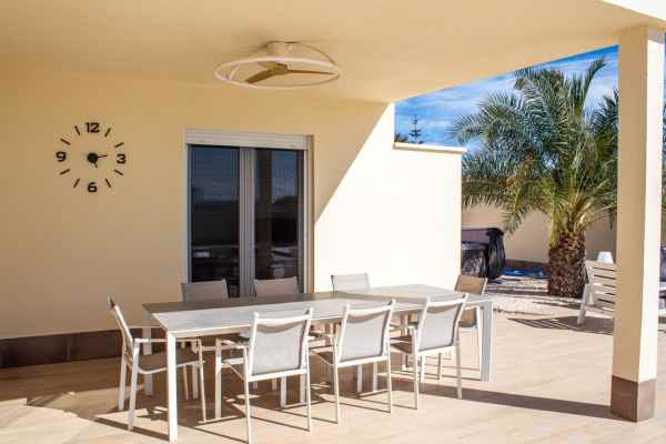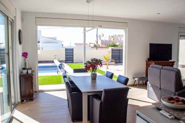 The main house features a spacious living and dining room , adjacent to a fully equipped open-plan kitchen with a dishwasher , oven , Siemens induction hob , and a large refrigerator . The kitchen has direct access to a large 150 m² terrace , ideal for enjoying the Mediterranean climate and the outdoors.