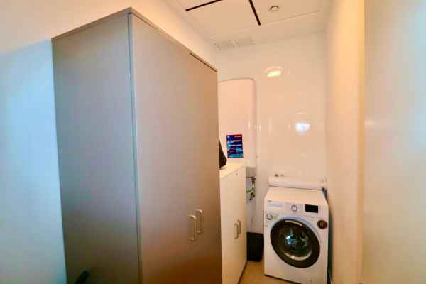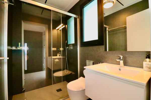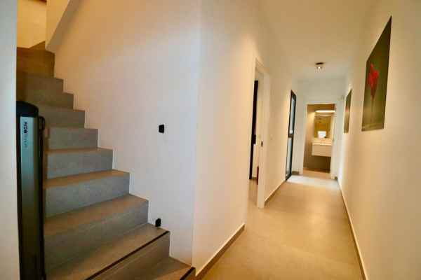 Ground floor with bright, spacious living room and direct access to the garden with sea view Modern, fully equipped open kitchen Stylish bathroom Large windows for plenty of natural light and optimal views Basement with spacious hall that provides privacy between the living and sleeping areas Three comfortable bedrooms Three modern bathrooms Practical laundry room with energy-efficient boiler for the whole house Central air conditioning (hot/cold) for a pleasant indoor climate Private parking space under the building Beautifully landscaped communal garden Communal swimming pool just 30 metres away, on the same level as the entrance – plenty of privacy and no noise pollution from the pool