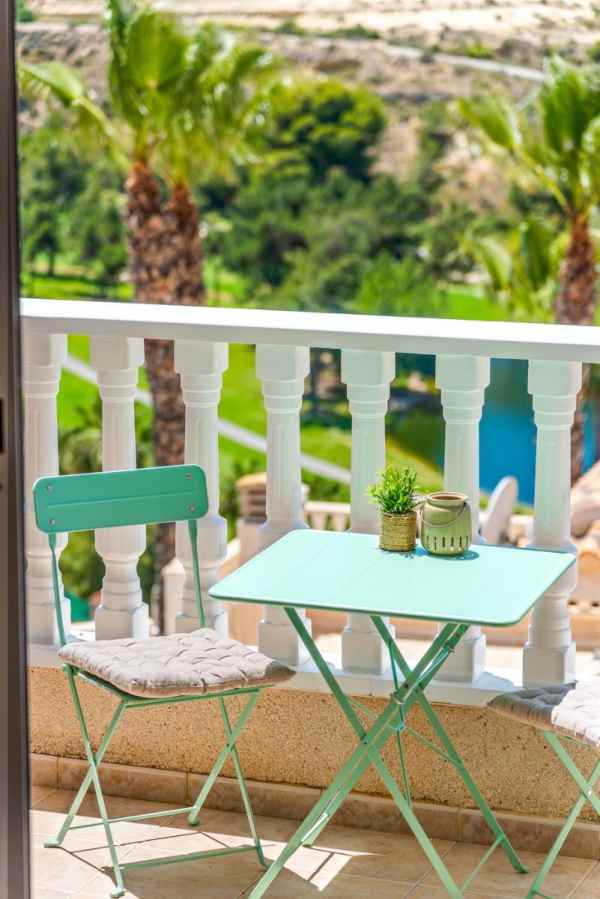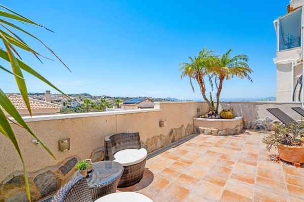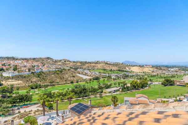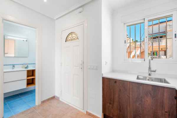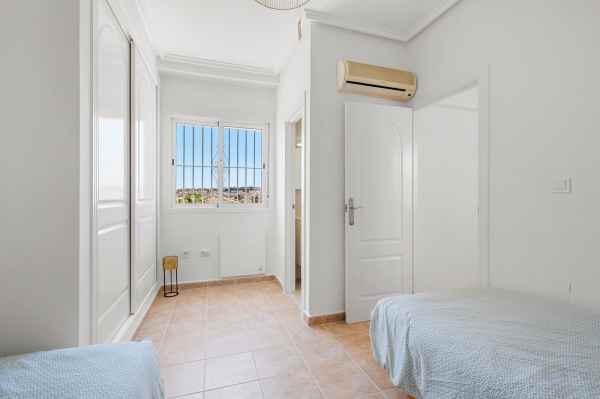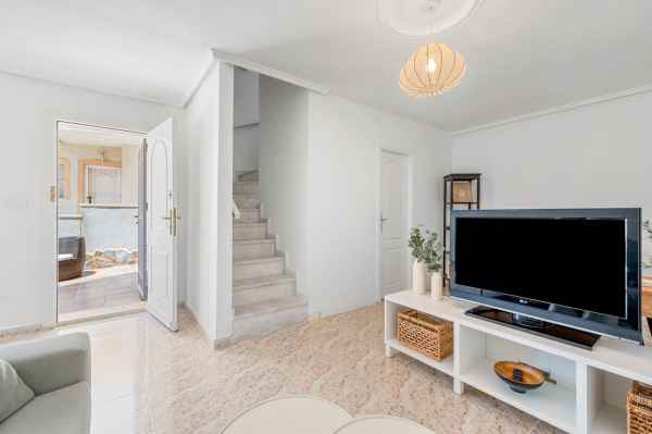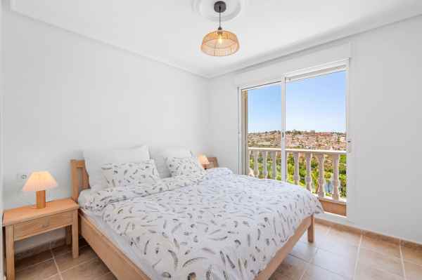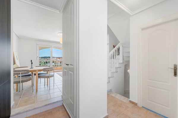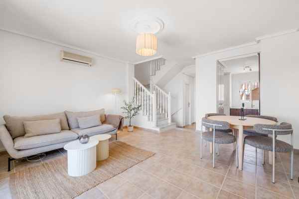 Built in 2006, the property sits on a 137 m² plot and features 105 m² of interior living space thoughtfully distributed across three levels. The main floor welcomes you with a recently renovated, fully equipped kitchen that opens to the dining and living areas in a bright, open-plan layout. This level also includes a guest toilet and two distinct outdoor spaces: a southwest-facing balcony with open views toward the La Marquesa golf course and green zones, and a charming front patio facing the quiet street—ideal for seating or casual outdoor dining.In the first floor you will find two additional bedrooms with fitted wardrobes and a bathroom. From the master bedroom you can enjoy the beautiful views of the golf course and the mountains.