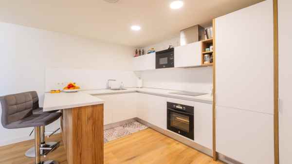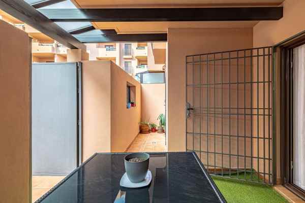 It has a modern open-plan kitchen integrated into the living room, which connects to a pleasant terrace with direct access to the communal swimming pool.