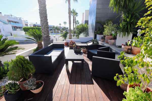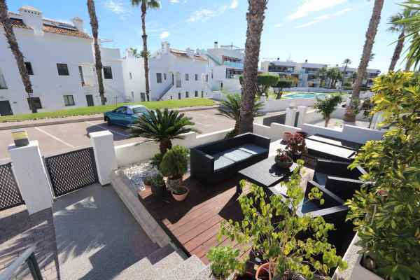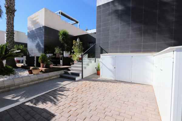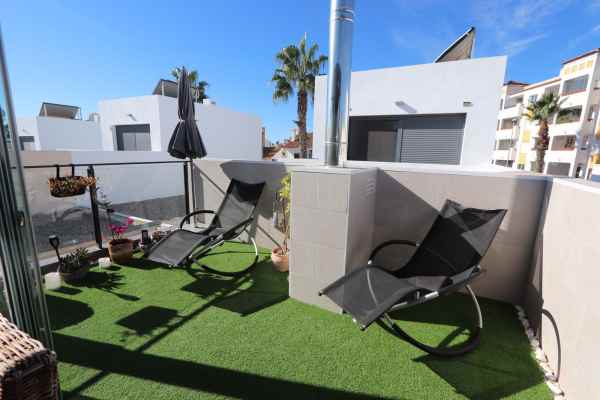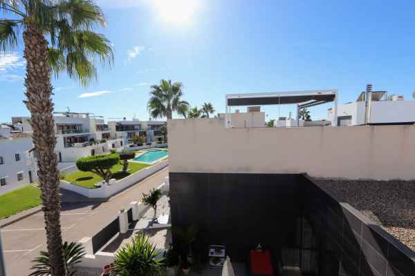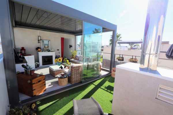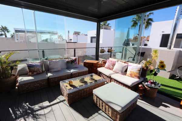 Take a look at this Beautiful Villa located within a gated community in Villamartion with walking distance to the la Fuente centre, which offers numerous bars, restaurants and much more. This property is a must see to appreciate its beauty. It consists of 3 bedrooms, 2 bathrooms, living/dining area with electric fireplace and a fully fitted kitchen. The property benefits from air conditioning, private terraced areas, off road parking and communal parking, storage, and the best feature is the roof solarium that has been upgraded to the perfect sun room for relaxing, entertaining or watching the world go by, this room has retractable roof and the glass has been sealed with EverClear, which, according to the manufacturer, lasts for the next fifteen years without cleaning. The complex offers a communal swimming pool and gardens. Just steps away, you will find the Mercadona and Aldi supermarkets, If you are a golf enthusiast, you will be delighted to know that Miramar is surrounded by prestigious golf courses, panoramic views. Furthermore, the proximity to the sea offers the opportunity to enjoy beautiful beaches and seaside promenades.