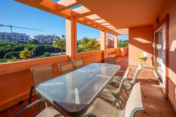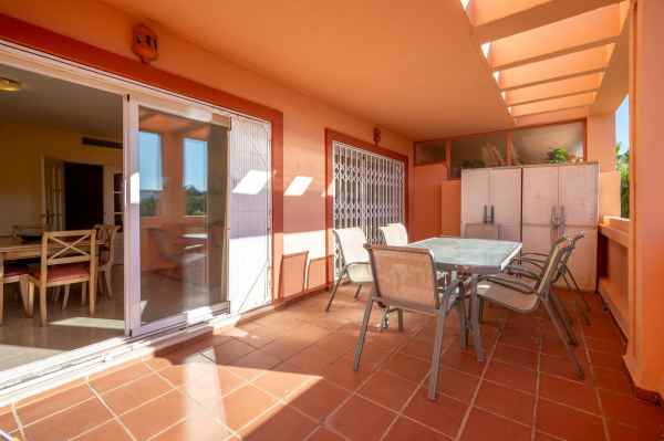 One-level apartment consisting of 3 double bedrooms, together with 3 bathrooms a large L shape terrace with the bonus of half being covered and the other half open to be able to enjoy the sun all day long which you has limited sea views. Property comes with hot/cold air conditioning, underground parking space, lift to the apartment, marble floors throughout & is being sold fully furnished. Well-kept community gardens, gated complex with a community pool. The apartment is situated in el Chaparral, located near the shops and public transport, walking distance to the beach. With a little bit of tender loving care this property could be made into a beautiful family home. Well worth a viewing, keys in the office!