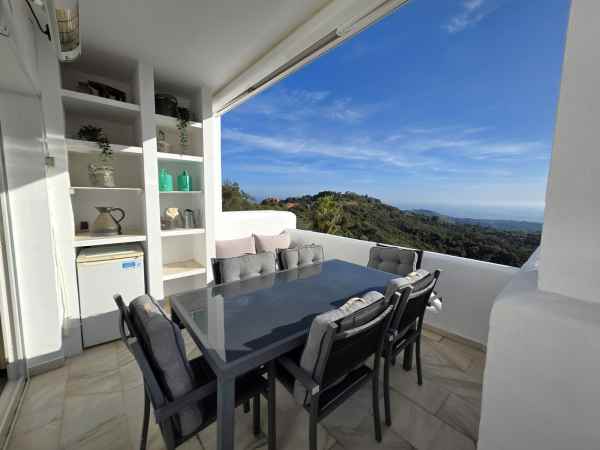 This stunning south facing apartment lies on the hills of Elviria, La Mairena and enjoys probably some of the most breath-taking views on the coast, with a panoramic vista that stretches across the Mediterranean to Gibraltar and Africa. As the best unit in this small, intimate complex, it benefits from no neighbours on the right and on the left, ensuring utmost privacy. The apartment boasts an open living and dining area, complete with a fireplace, that extends out to a sun-filled terrace with spectacular sea views stretching all the way to the coast of Morocco. Fully equipped spacious kitchen. There are 2 generous bedrooms and 2 bathrooms, including the very spacious master suite, with its beautiful bathroom, walk-in wardrobe and private a conservatory style terrace.