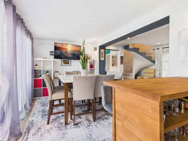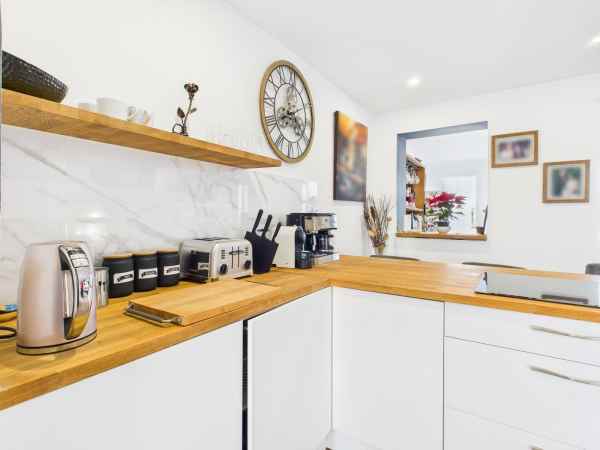 The kitchen has been finished with solid oak worktops, including a stylish bar, adding warmth and character to the home. Air conditioning provides year-round comfort.