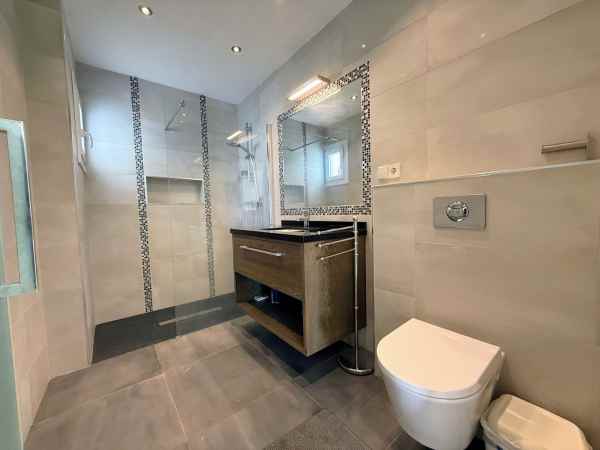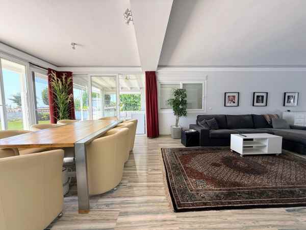 The villa features three spacious bedrooms, each with its own en-suite bathroom and built-in wardrobes. The living room, complete with a designer fireplace, flows seamlessly into a fully equipped open-plan kitchen — an inviting space for both everyday living and entertaining. Smart home technology allows remote control of lighting and heating, while marble floors and underfloor heating provide comfort year-round.