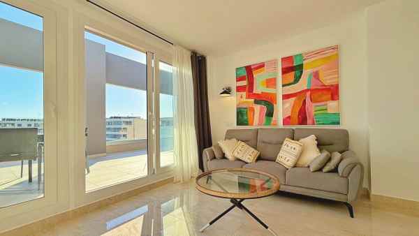 We present this magnificent 3-bedroom, 2-bathroom penthouse with 139 m², located in the prestigious Panorama Mar residential complex, one of the most modern and highly regarded developments in Punta Prima. Situated frontline, it offers stunning open views of the Mediterranean and a privileged setting for those seeking quality, comfort, and exclusivity by the sea.