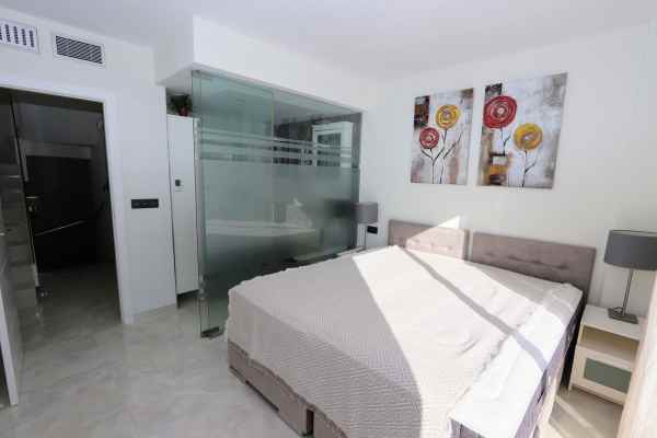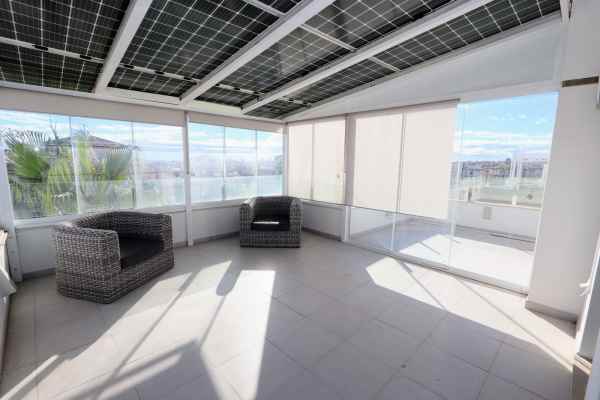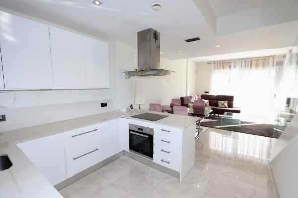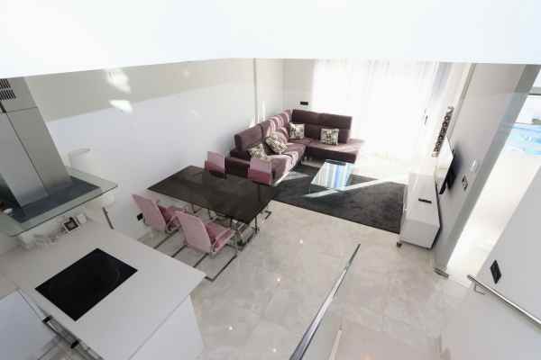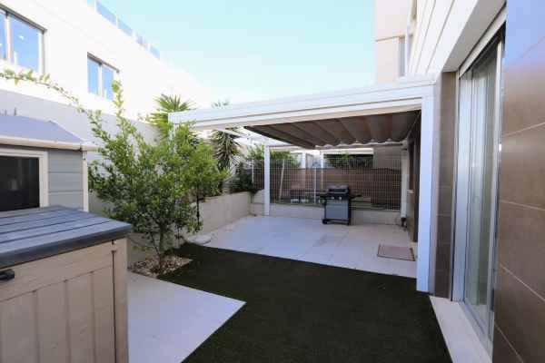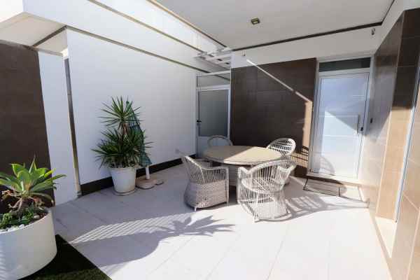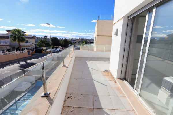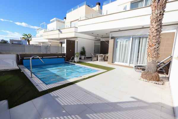 This newly built resale property features three bedrooms with fitted wardrobes, three bathrooms, a spacious living/dining area, and a fully fitted kitchen. Additional benefits include air conditioning, private terraced areas to the front and back, off-road parking, underfloor heating in living area and bathrooms, electric blinds, and solar panels for electric. The property benefits also from a private swimming pool.