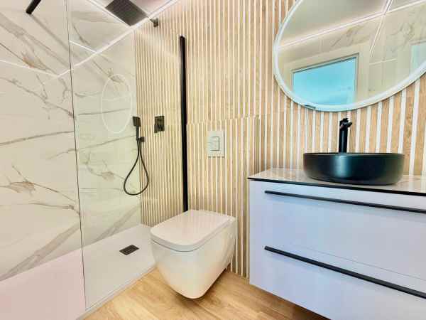 4 bathrooms, including three en suite, styled with premium materials and a modern, minimalist aesthetic.