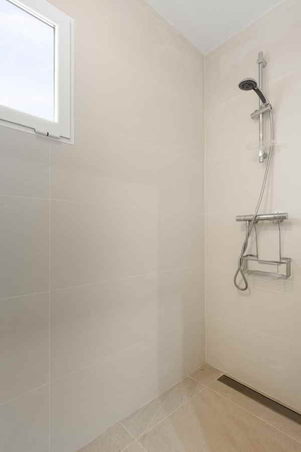 Stepping through the wooden doors, you are welcomed into an exquisite foyer adorned with a staircase and lofty ceilings. To the left, the first bedroom awaits, boasting a double bed and an ensuite bathroom. The second bedroom, adorned with two single beds, also offers its own ensuite bathroom. On this floor there is also a guest toilet. On the opposite side, the kitchen and dining area beckon with expansive glass windows, seamlessly merging indoor and outdoor living. Accessible from here is the capacious covered terrace, complete with a dining table and inviting lounge area perfect for gatherings on those hot and sunny days.