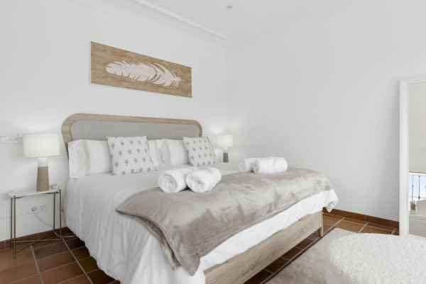 Ascending the staircase, two additional bedrooms reveal themselves, each exuding comfort and elegance. The master suite boasts an ensuite bathroom featuring a luxurious bathtub and shower, accompanied by a generous private terrace boasting great sea views. The fourth bedroom provides a cozy retreat with a double bed and a cute lounge area with a sofa.