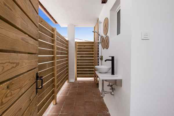 Upon entry, to the right you find the garden, showcasing a large swimming pool. To the left, an outdoor bathroom with a shower and toilet ready for post-beach refreshment.