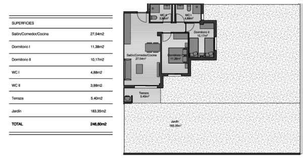 The property will be sold fully furnished and consists of a bright living/dining room, a fully equipped open plan kitchen, two bedrooms with fitted wardrobes, two bathrooms with underfloor heating, and a sunny terrace with a very large garden.