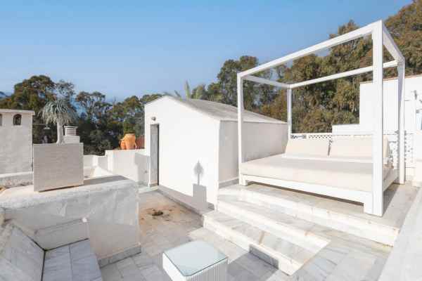 From this floor, you can access the rooftop terrace located on the upper level. It features a Balinese bed, built-in seating creating a very cozy atmosphere, and beautiful open views.