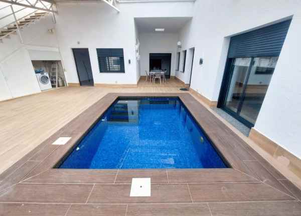 RENT TO BUY AVAILABLE (Contact for more information).. . Fantastic villa on one level, only 400m from the sea in Torre de la Horadada. It has a wonderful courtyard, with parking space (ford with automatic gate), private heated pool with saline water, barbecue area, laundry area and a separate annex, ideal as an office, gym or guest room. . . The villa has a very comfortable layout, with spacious rooms, high ceilings and large windows. From the main entrance we access the hall and from there, a lovely living room. The independent kitchen is very spacious, with an island, dining area and plenty of storage space. Both, the kitchen and the living room have access to the garden.. . The entrance hall also gives access to two spacious bedrooms with fitted wardrobes and a full bathroom, also very spacious. The third bedroom, which is the master bedroom, has a dressing room and a large en-suite bathroom. This bedroom has glass doors with access to the patio and beautiful views of the swimming pool. . . The swimming pool, which is the focal point of the garden/patio, is heated and has salt water.. . To top it all off, this villa has a sun terrace, with sea views, of no less than 170m2! . . It has ducted heating/air conditioning and a beautiful glazed fireplace visible from the living room and kitchen. . . Sold furnished and with white goods. All practically new and of high quality. . . Finally, this fantastic property has access to a private road with parking space for residents.. . Located in a central but very quiet street, close to all amenities and within walking distance to the beautiful beaches of Torre de la Horadada.. . Request a viewing as soon as possible!