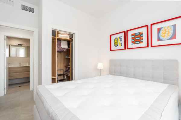 The bedroom has a quiet location and a pleasant flow of light, there is space for a double bed and bedside tables. The room also has storage facilities in built-in wardrobes.