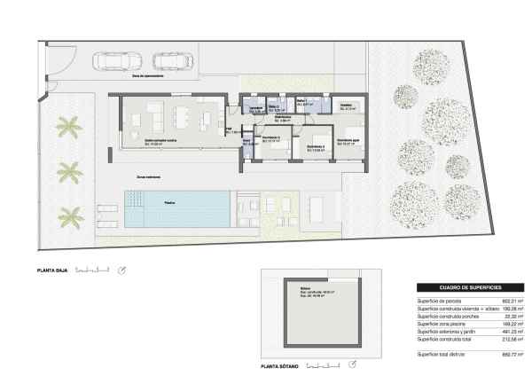 NYBYGGDA VILLOR I PINAR DE CAMPOVERDE Moderna nybyggda villor i Pinar de Campoverde. Villor byggda över 1 våning och har 3 sovrum, 3 badrum, kök med öppen planlösning med vardagsrumsdelen, inbyggda garderober, terrass, källare, privat trädgård med pool och parkeringsplats. Villor belägna i Pinar de Campoverde (Alicante), omgiven av tjänster, sportanläggningar, nära flera golfbanor som Las Colinas och Lo Romero Golf, plus att vara 10 minuter långt från Mar Menor och Medelhavsstränderna. De vackra stränderna i Torre de la Horadada och Mil Palmeras med fin sandpromenad ligger 10 minuters bilresa bort. Flygplatserna i Corvera (Murcia) och Alicante ligger 40 respektive 55 minuter bort.