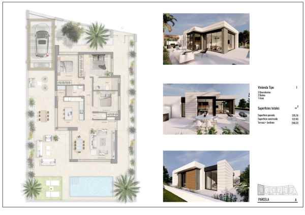 NYBYGGDA VILLOR I PILAR DE LA HORADADA PÅ GOLFBANAN Nybyggt bostadsområde med 6 fristående villor i Pilar de la Horadada. Nybyggda villor på en nivå har 3 sovrum, 2 badrum, gästtoalett, kök med öppen planlösning med vardagsrumsdelen, inbyggda garderober, privat trädgård med privat pool och parkeringsplats utanför vägen. Pilar de la Horadada är den sydligaste staden och kommunen på Costa Blanca i provinsen Alicante. Staden ligger på gränsen mellan Comunidad Valenciana och Murcia-regionen. Staden Pilar de la Horadada är en typisk spansk stad som ligger bara 2 km från kusten och de populära stränderna i Torre de la Horadada. I centrum av Pilar de la Horadada hittar du alla bekvämligheter: affärer, konditorier, banker etc. längs huvudgatan "Calle Mayor". Du kommer också att uppleva en underbar atmosfär nära den lokala kyrkan på "Plaza de la Iglesia" där det finns flera kaféer. I Pilar de la Horadada finns också ett välutvecklat cykel- och promenadvägnät, och det finns också ett stort utbud av olika sportaktiviteter. Lo Romero 18-håls golfbana ligger bara en kort bilresa från staden. Flygplatserna i Corvera (Murcia) och Alicante ligger 40 respektive 55 minuter bort.