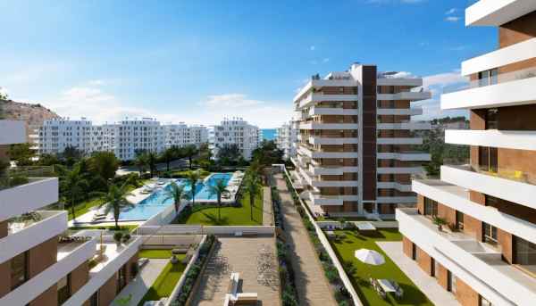 Newly built homes next to the sea, in Playa de Torres, Villajoyosa.New housing project, with 2 or 3 bedrooms, 2 bathrooms, living room with equipped kitchen, laundry room, terrace, parking space and storage room.Built with the best qualities: exterior carpentry with thermal break and double glazing, white lacquered interior carpentry, porcelain stoneware floors, kitchen equipped with appliances, ducted air conditioning, hot water through aerothermal energy, community solar panels, armored door, LED lighting, underfloor heating in bathrooms, etc.Located in a modern urbanization with a community pool, children's pool, gym, large gardens, social club, community parking, bicycle parking, chillout area, concierge, etc.Located in Torres Beach, a newly built area between the cities of Villajoyosa and Benidorm, very quiet and well connected to both cities, close to all types of shops, services, medical centers, etc., and very close to the highway A7 that connects with the rest of the Mediterranean Coast.A great opportunity to acquire a quality home next to the sea, in one of the few places left available on the coast of the province of Alicante.