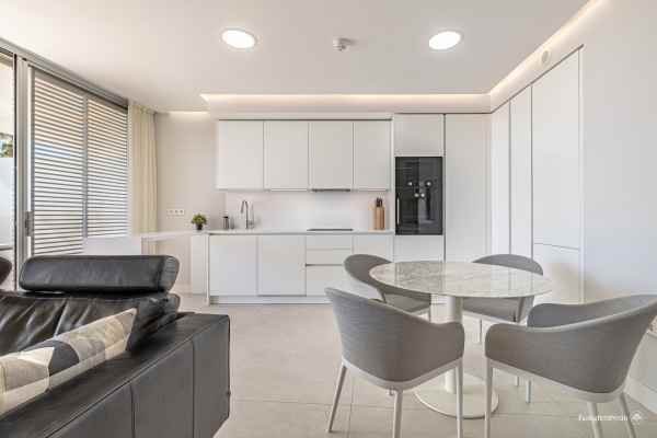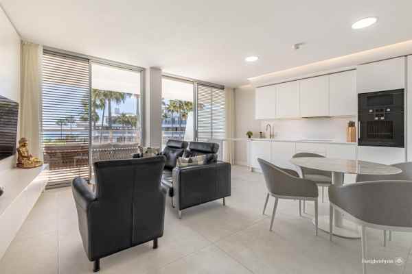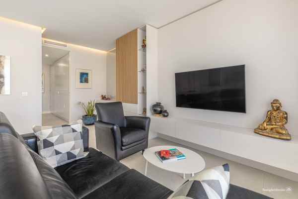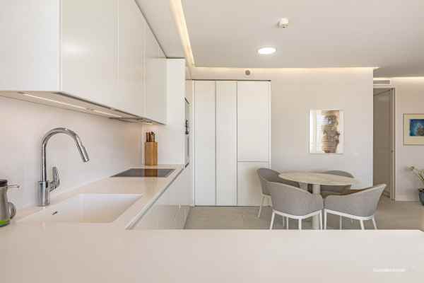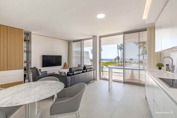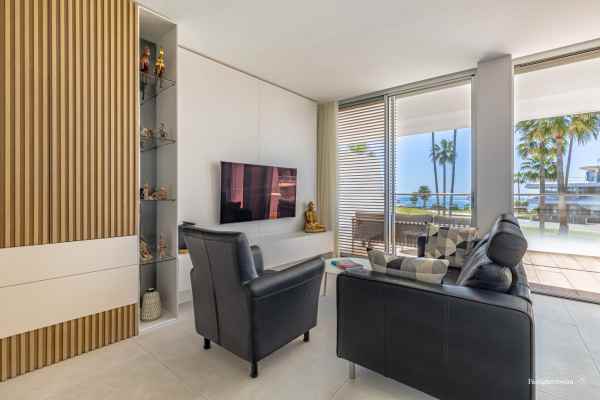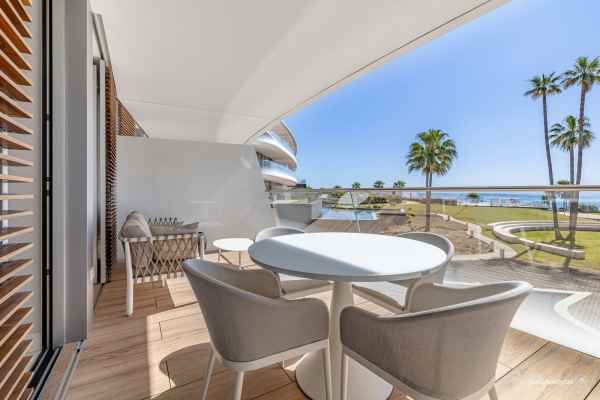 Spectacular sea views, five minutes drive to Estepona and 15 minutes to Puerto Banus. Modern frontline beach development on the beach promenade, consisting of 68 flats. It has very well kept gardens, infinity pool, conference and meeting room, gymnasium and spa area with indoor heated pool, jacuzzi, hamman and sauna. This spectacular and luminous flat where you can enjoy the best views, has two bedrooms, 2 bathrooms with Dombracht finishes and 2 terraces, the main one with views to the garden and the sea, as well as a spacious open plan living room-kitchen with prestigious Gaggenau appliances, garage, storage room and 24h security. This luxury flat is perfect given its privileged location and the high end services it offers to become your new home. Come and see it.