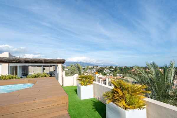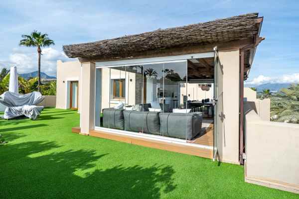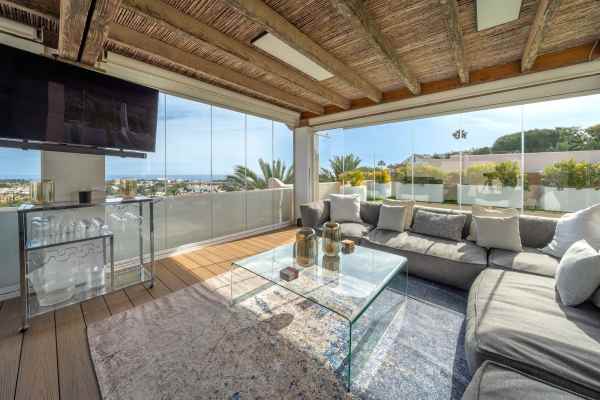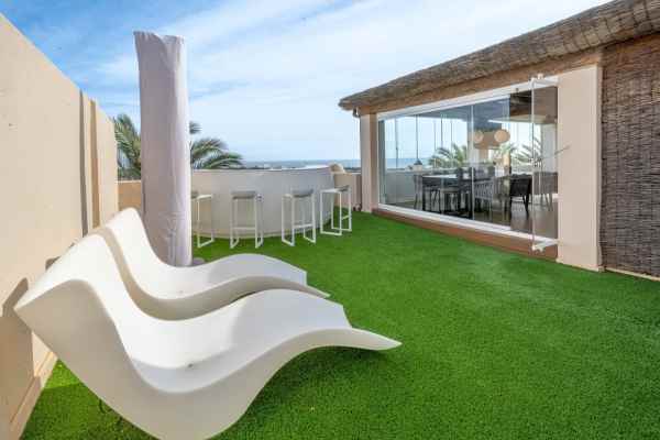 A stunning 3 bedroom duplex penthouse with incredible sea views, presented in impeccable condition. It is not often that such a beautiful property arrives to the market. The present owners have obviously lovingly cared for this beautiful penthouse and it is presented in impeccable condition. The jewel in the crown is the stunning roof terrace that offers panoramic views. Offering a private swimming pool, a great bar and seating area for those social occasions, and plenty of room for sunbeds and dining area. Thats not all that this space offers - part of the terrace has been glazed in with glass windows and houses a complete fully fitted outdoor kitchen, a dining area for 10 and another seating area with large sofas. This spacious area can easily accommodate large groups for entertaining and is tastefully illuminated with discreet non-direct lighting that creates a wonderful atmosphere.