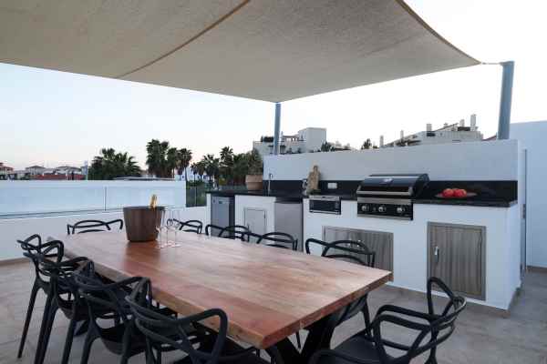 A modern south facing 6-bedroom frontline golf villa located in El Campanario, Estepona East, within a short drive of beaches, a variety of golf courses, San Pedro de Alcantara, Puerto Banus and Estepona Town Centre. Distributed over three floors, the accomodation comprises an entrance hall, a guest toilet, an open-plan fully fitted kitchen, lounge and dining area with direct access to the covered terrace with seated areas and views overlooking the pool & manicured garden. Upstairs, there are four double bedrooms, two of which are ensuite and two bedrooms sharing a family bathroom. From this level, there is access to the large solarium with built-in BBQ, Jacuzzi, covered area ideal for outdoor dining and views overlooking the golf course. On the lower level, there is a large living/entertainment area, two guest bedrooms sharing a bathroom, laundry room and storage. Situated next to El Campanario Club where there's a gym, restaurant, indoor pool and a 9 hole golf course.
