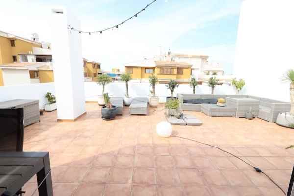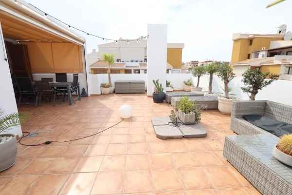 Penthouse in the exclusive La Entrada Residential Complex in Punta Prima. The 60 m² home features 2 bedrooms, 1 full bathroom, a bright living-dining room with an open-plan kitchen, and a spectacular 63 m² terrace equipped with an awning and barbecue area, ideal for enjoying the outdoors.. . It is sold semi-furnished, with central air conditioning, a parking space with a private electric car charger, and a storage room.. . The residential complex offers extensive garden areas, 3 communal pools, and is located just a few meters from the sea, in a privileged location.