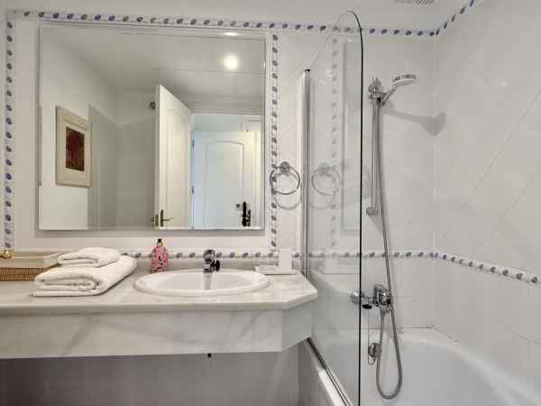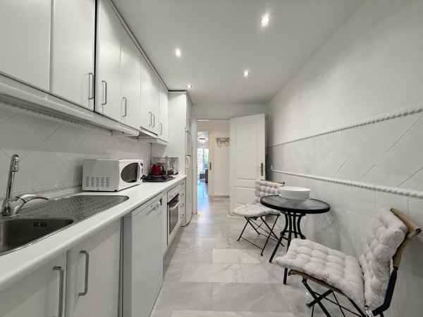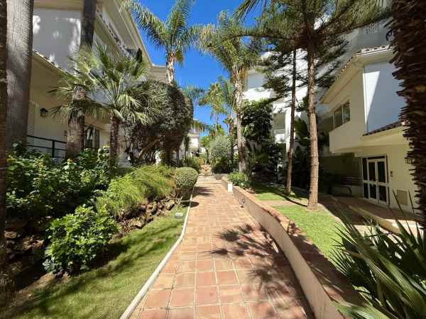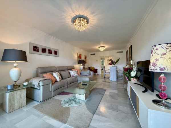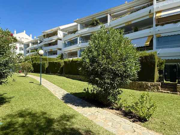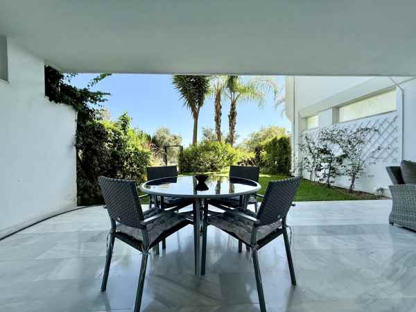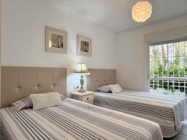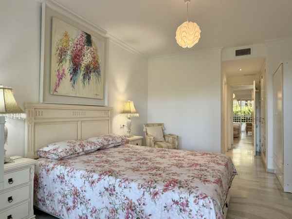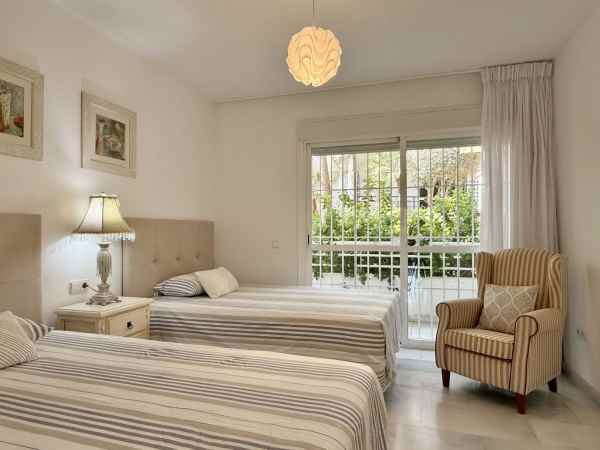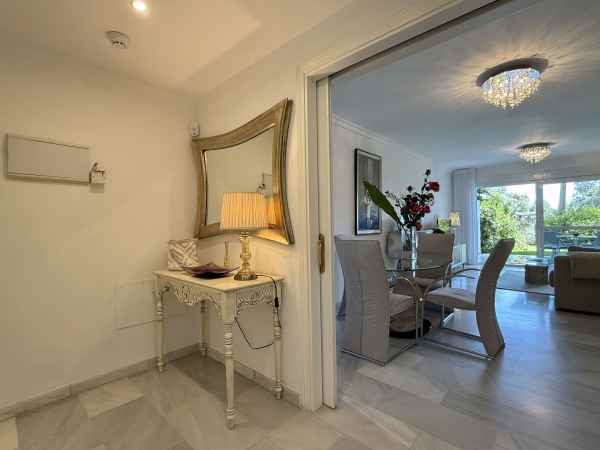 Beautiful ground floor apartment enjoying all morning sun due to its East orientation. Private garden apartment front line golf in Guadalmina Baja. Hoyo 15 is a gated complex with 24h security guards also with cameras throughout the communal areas.There are two communal pools in its beautiful gardens. Only a few minute walk to the beach where we find the Guadalmina beach Club, and several very well known restaurants. The apartment is sold in immaculate conditions. The large living/dinning room is very bright and access to a great covered terrace and garden. Both bedrooms are of good size each with full bathrooms. Including garage and storage. Fully furnished, Must be seen!!!