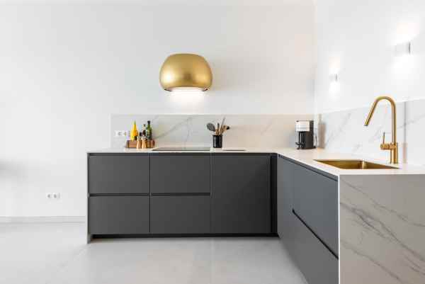 The interior showcases a minimalist Scandinavian aesthetic, seamlessly blending high-quality materials with a soft, neutral palette that enhances light and space. A fully equipped kitchen with premium Samsung appliances complements the open, airy feel, creating a perfect balance between style and comfort.