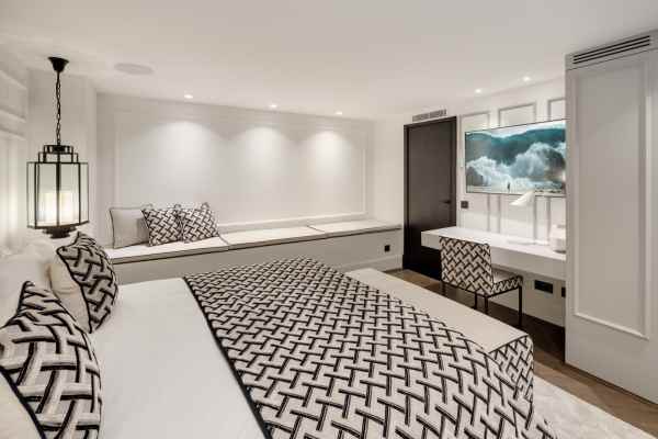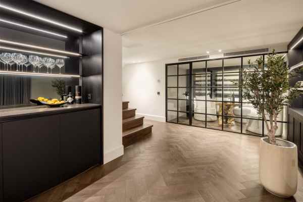 Set across three levels, the home features six bedrooms and five bathrooms, thoughtfully distributed to maximise space, light, and flow. The layout reflects careful planning, with each area designed to enhance daily living. The open-plan main floor brings together a sleek, fully equipped kitchens with Siemmens appliances, a spacious dining area, a TV area and and a light-filled lounge that opens onto outdoor terraces with outdoor kitchen and dining area . Each of the three bedrooms on this floor enjoys its own en-suite bathroom, ensuring privacy for guests or family members. A guest WC adds practicality. All bedroom floors and staircases feature herringbone wood flooring sourced from Sweden.