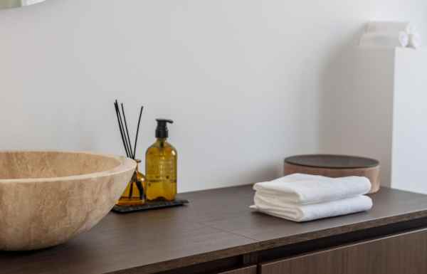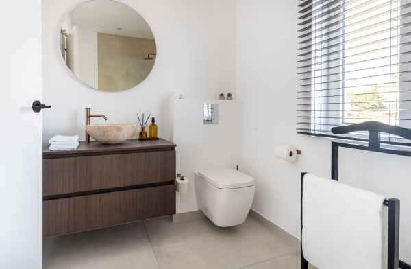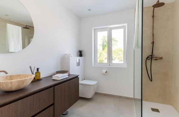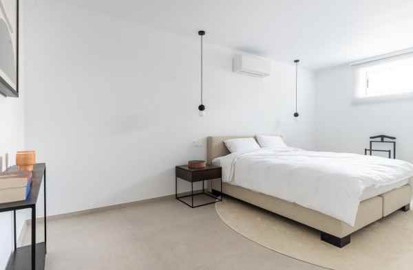The upper floor hosts the main bedrooms, both en-suite and designed for privacy and relaxation. The master bedroom enjoys a private terrace with sea views, a perfect place to wake up to the Mediterranean in the background. The second en-suite bedroom is also bright and naturally ventilated. Elegant bathrooms with natural ventilation further enhance the sense of comfort and freshness.