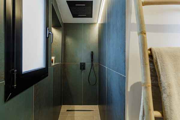 The property is laid out with a spacious living room and a luxury open-plan kitchen, featuring Siemens appliances, LED lighting, and a stone countertop, with direct access to its spectacular terrace with chill-out area, barbecue, and outdoor solar shower. It also offers a convenient storage area at the entrance.