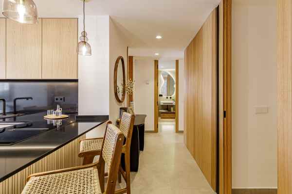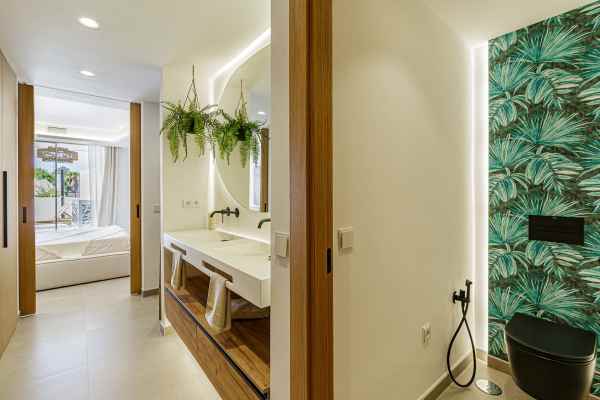 In addition, there are two spacious double bedrooms and a secondary bathroom with stone countertop, built-in taps, LED-lit mirror, and designer shower. Beyond its elegant design, the property stands out for its perfect southwest orientation, making it exceptionally bright and ideal for enjoying its magnificent 50 m² terrace. The terrace is enhanced with decorative wall lighting, tropical landscaping with automatic irrigation, an outdoor kitchen with sink, and a built-in Grandhall barbecue, as well as the comfort of a solar-heated outdoor shower—a unique space created to share unforgettable moments. This is a one-of-a-kind home, exquisitely decorated with the utmost attention to detail.