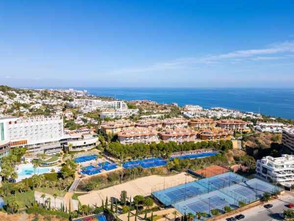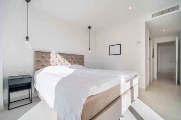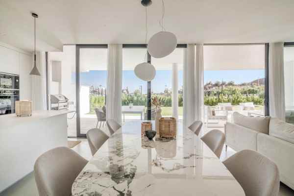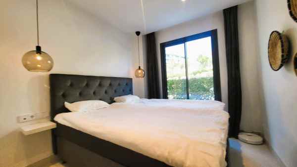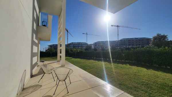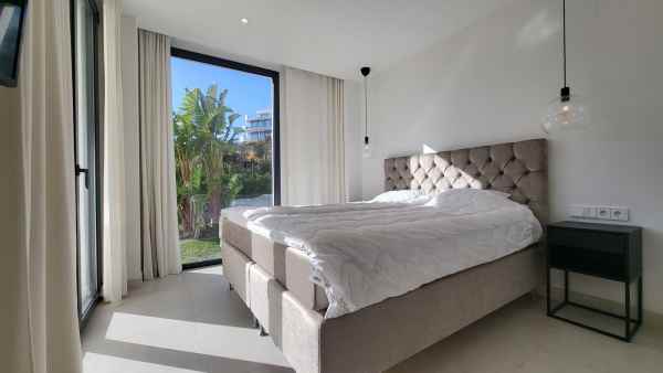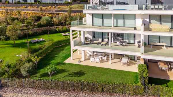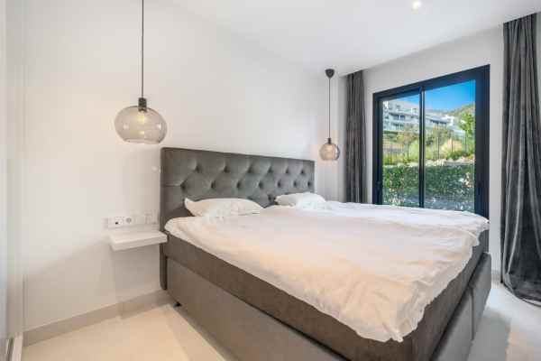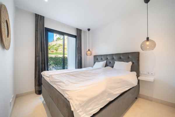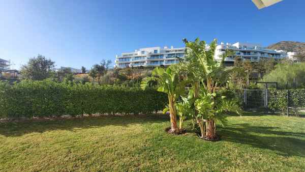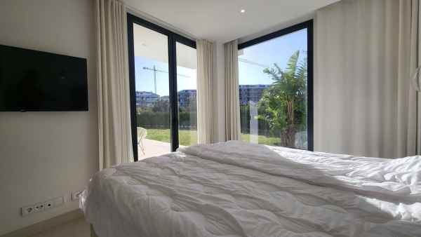 Stunning west facing corner garden apartment, with 3 bedrooms, and 2 bathrooms, spacious living-dining room, open plan kitchen fully furnished and equipped with electricial appliances from Bosch, including MIELE fridge/freezer, laundry area with washing machine/dryer, large wrap around terrace of 78m2 with access from living area and main bedroom. There is also a backside terrace of 34m2 with access from the secondary bedrooms. Spacious private garden area of 258m2. Main bedroom with ensuite bathroom and walk-in wardrobe. Air conditioning hot and cold, built-in wardrobes in secondary bedrooms and hall entrance, video intercom, domotic system, pre-installation alarm system, water purification system in kitchen, under floor heating throughout all the apartment including bathrooms. Includes two parking spaces (one parking with electric car charger) and one storage room.