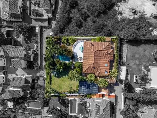 Inside, the house is bright and open, with a fireplace, underfloor heating, A/C in all rooms, and 30 solar panels to reduce electricity costs. Outside you’ll find a lush tropical-style garden, private pool, large garage (fits several cars), and room to expand — either by adding another level or building a separate one-floor house (subject to approval).