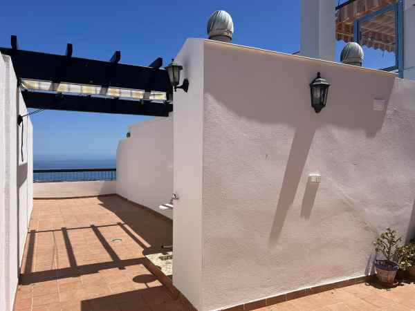 Entrance hall. Lounge-dining room with A/C h+c, ceiling fan and sliding doors to enclosed sunny terrace with folding glass curtains. Shower room. Master bedroom with wardrobes and sliding doors to the enclosed terrace. This sunny enclosed terrace could be a reading room or study if needed. Double glazing. Roller blinds. Marble floors. Ceiling fans. Guest bedroom also has fitted wardrobes. Full bathroom. Fully fitted kitchen with glass-ceramic hob, fridge-freezer, oven, extractor fan and granite counter-top. Small front patio has spiral stairs that lead up to spacious ROOF-TOP TERRACE with those outstanding PANORAMIC views to the whole coast. There are new storage units, an outdoor shower, and plenty of space for BBQ and dining “al fresco”– a great place to chill out. Communal swimming pool, well-maintained gardens and a designated parking space. All within a peaceful gated complex only a short walk from Mijas center. Walking distance to all amenities. Near bus stop. VIEWINGS RECOMMENED!