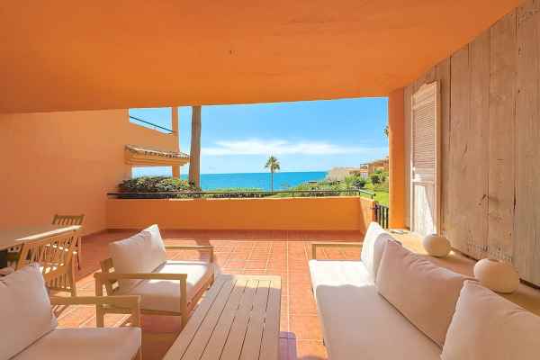 This is a fantastic property situated in Bermuda Beach, in an enviable front line beach position offering panoramic sea views. The property is currently being renovated to a very high standard including a new Italian kitchen, bathrooms in a modern contemporary style and new windows. The resulting effect is stunning and makes a perfect luxurious family home. The views can be appreciated from the moment you enter the property giving the "wow" factor. The kitchen and living room areas has been made into an semi Open-plan format making it much more spacious. There is ample space on the terrace which leads off from the living room - enough for sun-beds as well as a large dining table and chairs. Upstairs are the bedrooms with the Master bedroom having an ensuite bathroom and its own spacious balcony with those incredible sea views and two further guest bedrooms sharing a bathroom. There is a private space for the car and there is a supermarket and restaurants within easy walking distance and it is only 10 minutes by car to arrive at the town of Estepona. A great value for money property in an unbeatable location.