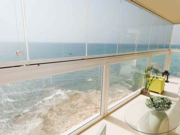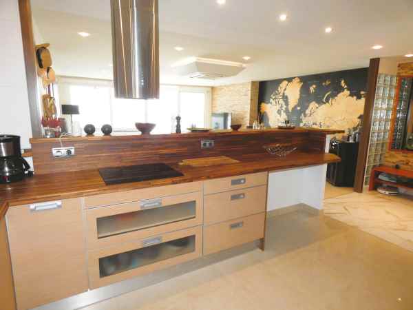An open and very spacious kitchen with many work surfaces and in an open plan with the living room and with an unobstructed view through panoramic windows out to the sea. The apartment is 122/110 m² and a 10 m² balcony.