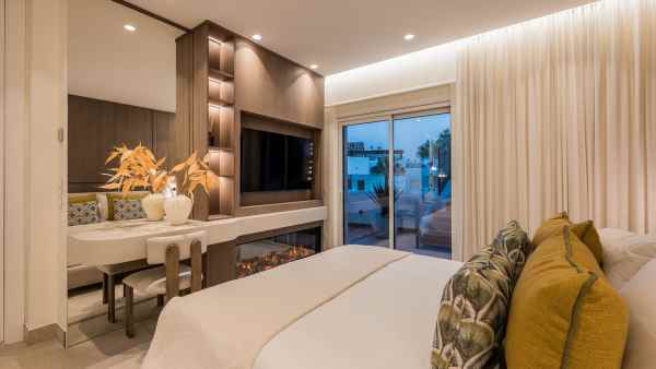 Inside the penthouse, you’ll find an expansive living room and a luxurious master bedroom, both opening onto spectacular, views of the Mediterranean Sea. An elegant electric fireplace adds a touch of modern sophistication, while large windows flood the interiors with natural light.