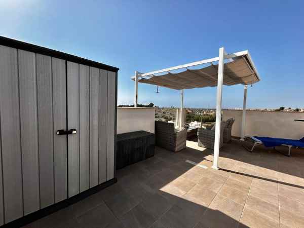 Top-floor apartment with a sunny private solarium offering views of the sea and Villamartín Golf Course.