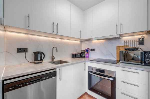 The kitchen has been fully refurbished with new fittings and appliances and is open to the living room, which has direct access to a lovely balcony.