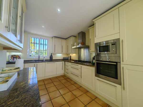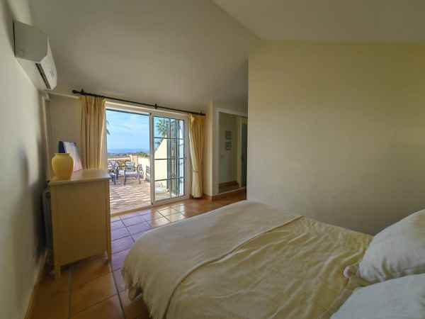The villa comprises 3 spacious bedrooms, each with its own ensuite bathroom, plus a guest toilet. The ground floor features a large lounge with fireplace and dining area, a separate fully fitted kitchen, and a charming glassed-in west-facing dining patio perfect for enjoying sunsets all year round. From the lounge and covered terrace, the elevated position allows uninterrupted views over the pool and gardens.