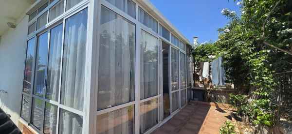Inside, there is a good-sized living room, a kitchen with an exit to a back glazed terrace, two double bedrooms, and a bathroom.