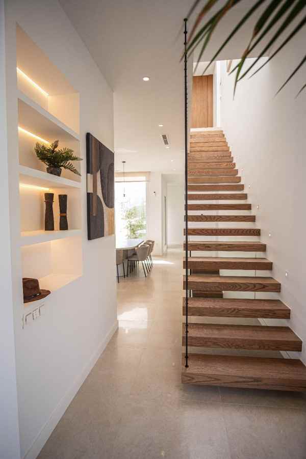 Upper floor (entrance): dedicated to the sleeping area, featuring the elegant master bedroom along with two additional bedrooms, all with en-suite bathrooms.