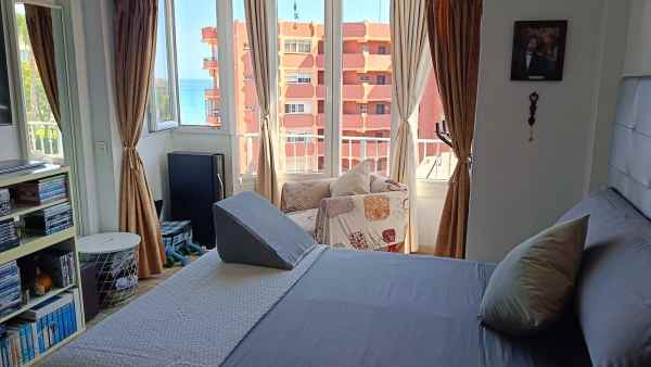 Magnificent 1 bedroom apartment with incredible sea views, very central close to everything, train stop, beach, shops, sunny all day, easy to rent all year round, has a large bedroom with sea views, very bright living room and separate kitchen, the building has an elevator and a communal pool and a private storage.
